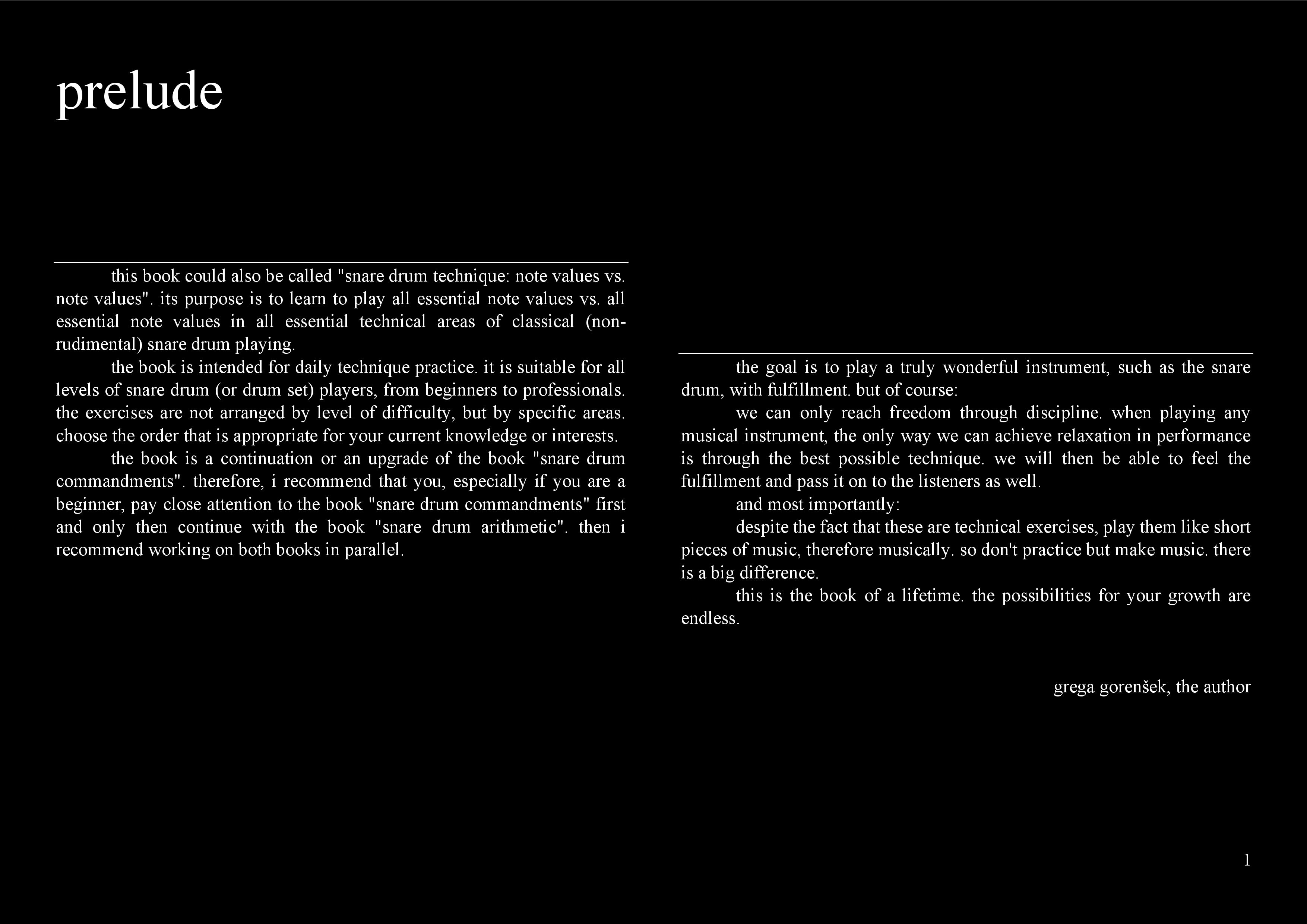 ta knjiga bi se lahko imenovala tudi ''tehnika za mali boben: notne vrednosti proti notnim vrednostim''. namen knjige je, da se naučimo igrati vse bistvene notne vrednosti proti vsem bistvenim notnim vrednostim v vseh bistvenih tehničnih prvinah klasičnega (nerudimentalnega) igranja na mali boben.