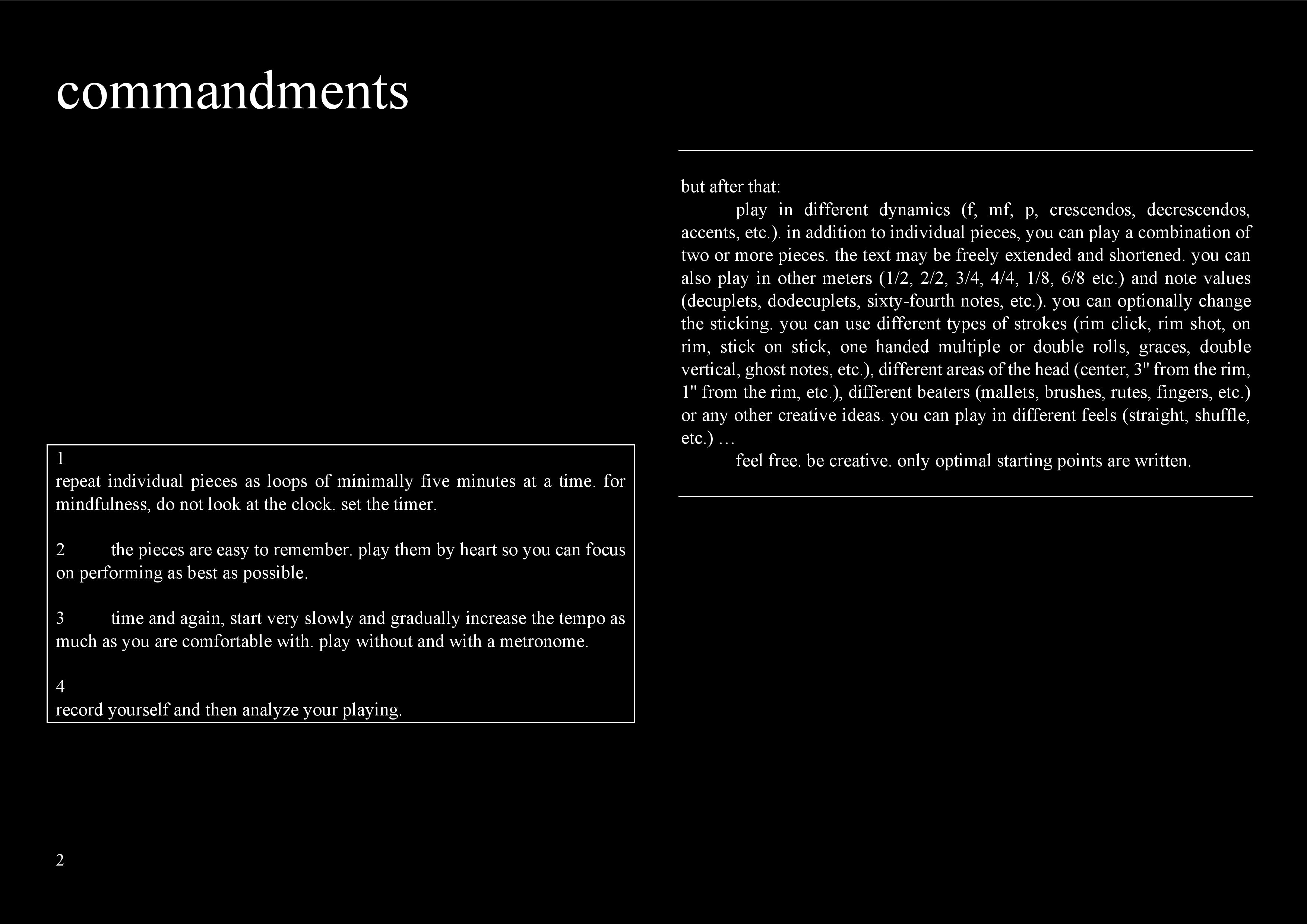 je nadaljevanje ali višja stopnja knjige ''zapovedi za mali boben''. zato priporočam, da se najprej, sploh če ste začetnik, dobro posvetite knjigi ''zapovedi za mali boben'' in šele nato nadaljujete s knjigo ''aritmetika za mali boben''. potem priporočam, da delate vzporedno na obeh knjigah.